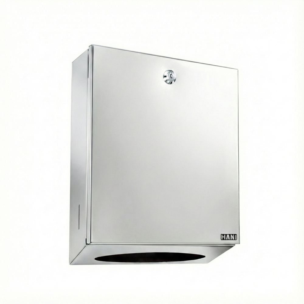 Lukittava käsipyyhekaappi, kiiltävä rst (Hani-Tuote tuotenumero: 5511). Muotoiltu annosteluaukko helpottaa käsipyyhkeen annostelua. Kotelossa tarkastusaukko täytöntarpeen seurantaa varten. Vetoisuus noin kaksi käsipyyhepakkausta. Tuote on sama kuin 5510, mutta lakattu antimikrobisella lakalla.