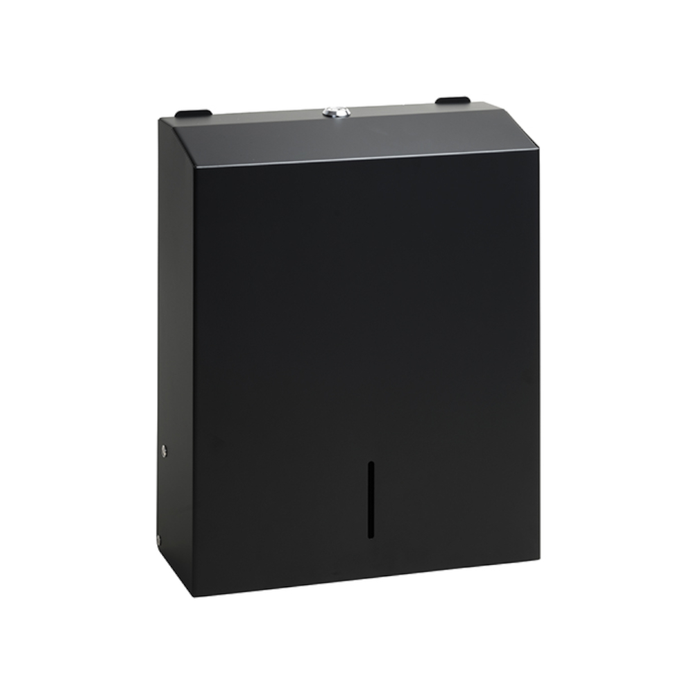 Ruostumattomasta teräksestä valmistettu musta käsipyyheannostelija. Seinäkiinnitys, kiinnityspisteet annnostelijan takana piilossa.