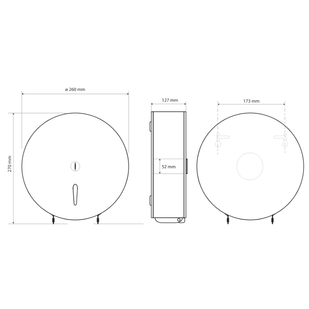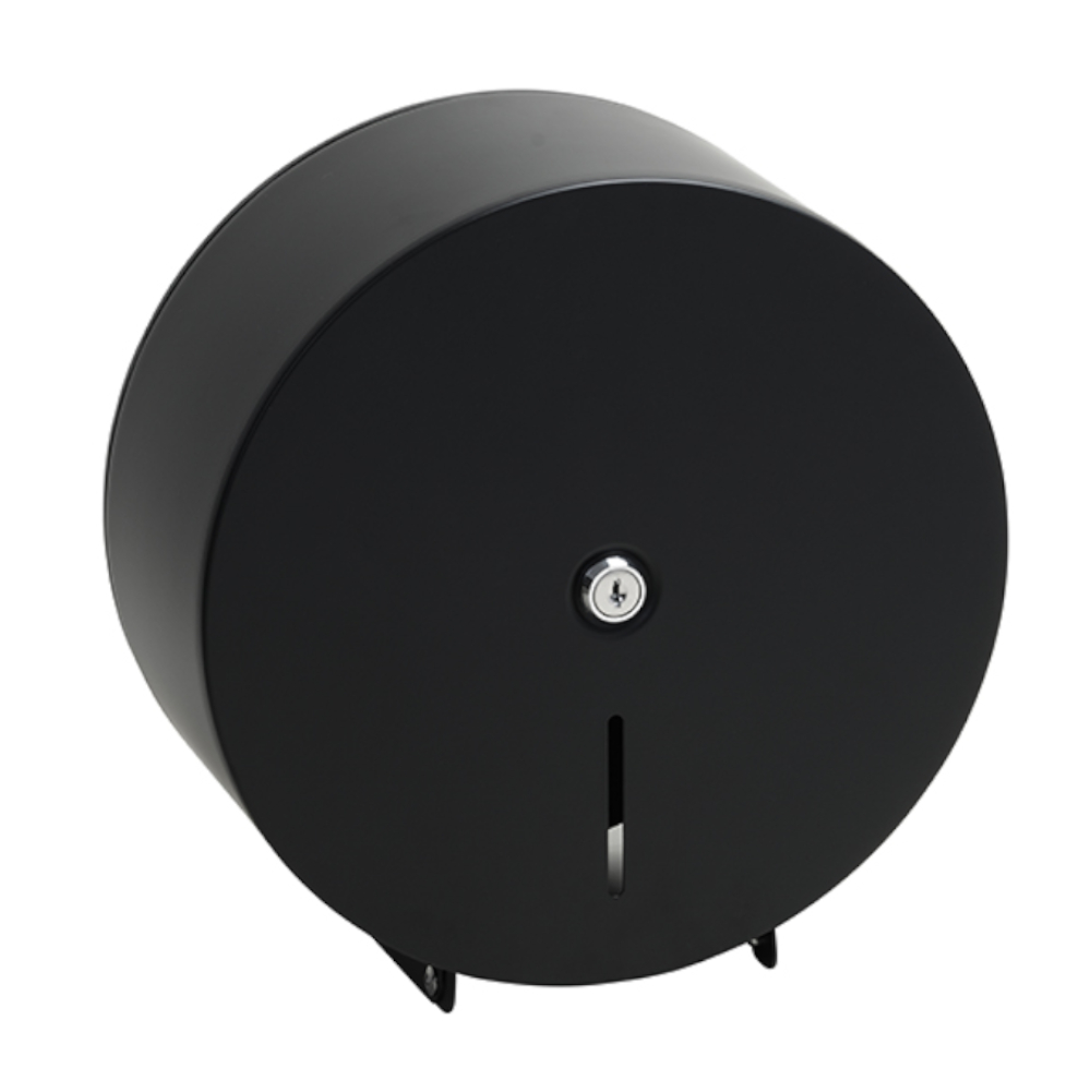 Ruostumattomasta teräksestä valmistettu musta Jumbo-rulla annostelija. Pakkauksessa kaksi avainta. Seinäkiinnitys, kiinnityspisteet annostelijan takana piilossa.
