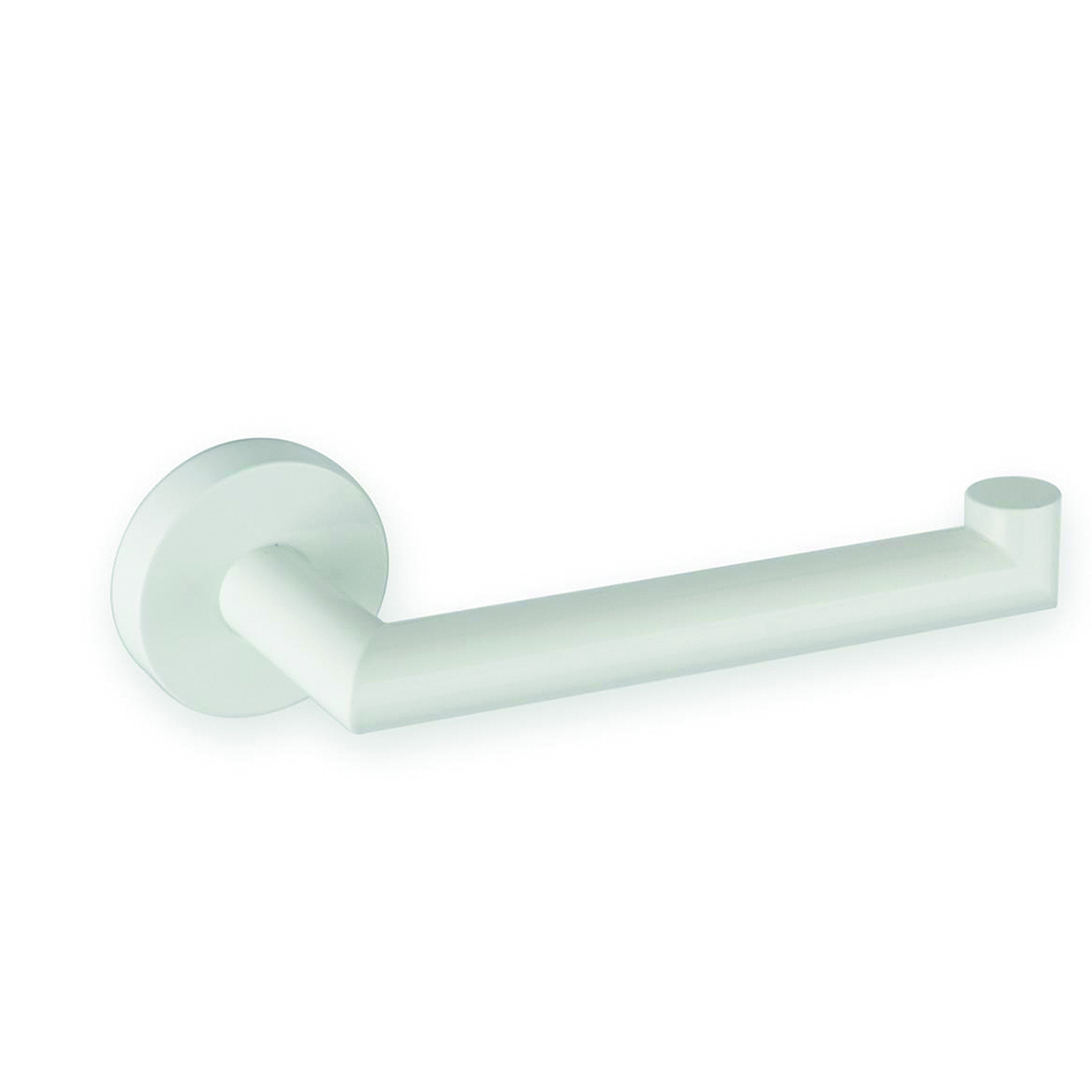 Valkoinen WC-paperiteline ilman kantta. Valmistettu messingistä. Seinäkiinnitys, kiinnityspisteet peitelaipan alla.