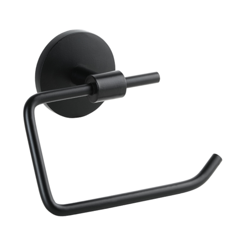 Musta WC-paperiteline ilman kantta. Valmistettu sinkistä. Seinäkiinnitys ruuveilla, ruuvit piilossa peitelaipan alla.