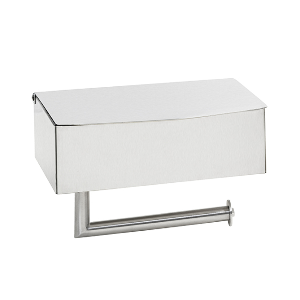 Tyylikäs wc-paperiteline, jossa pieni kannellinen säilytysrasia. Valmistettu ruostumattomasta teräksestä.