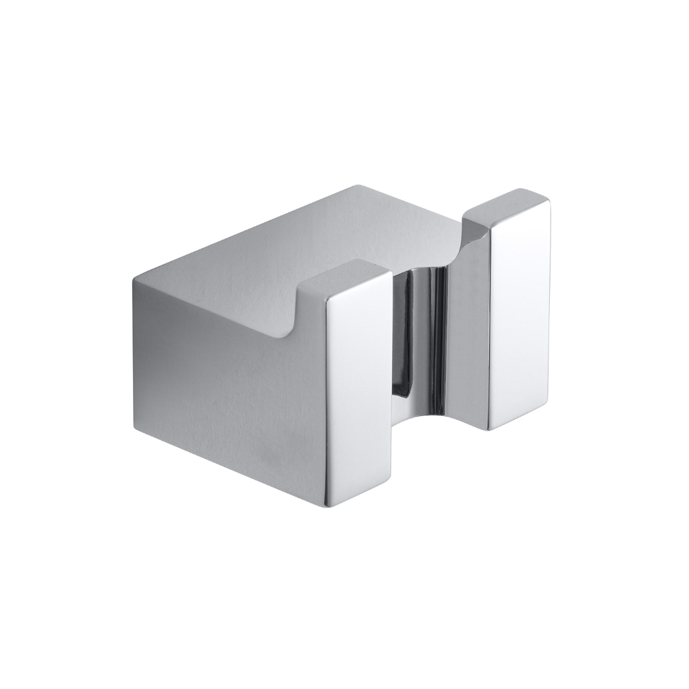 Kromattu tyylikäs kaksoiskoukku. Seinäkiinnitys, kiinnitysruuvit piilossa peitelaipan alla.