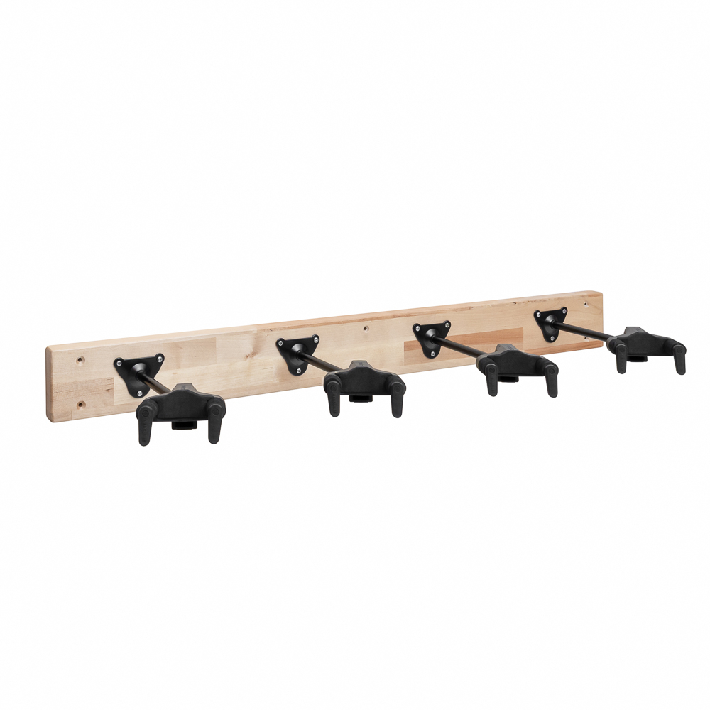 Puinen 1000 mm seinäteline neljälle kitaralle. Tuotteessa on kiinnitetty neljä käännettävää Hercules HCGSP-40WB -kitaratelinettä lakattuun koivulautaan. Telineet on sijoiteltu lautaan siten, että lautoja voidaan asentaa useampi vierekkäin yhdeksi kokonaisuudeksi.