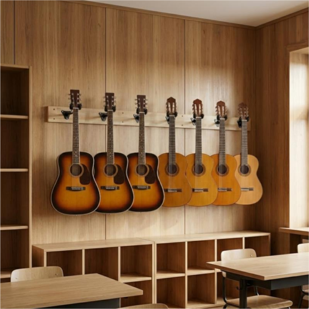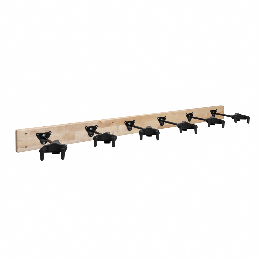 Puinen 1500 mm seinäteline kuudelle kitaralle. Tuotteessa on kiinnitetty neljä käännettävää Hercules HCGSP-40WB -kitaratelinettä lakattuun koivulautaan. Telineet on sijoiteltu lautaan siten, että lautoja voidaan asentaa useampi vierekkäin yhdeksi kokonaisuudeksi.