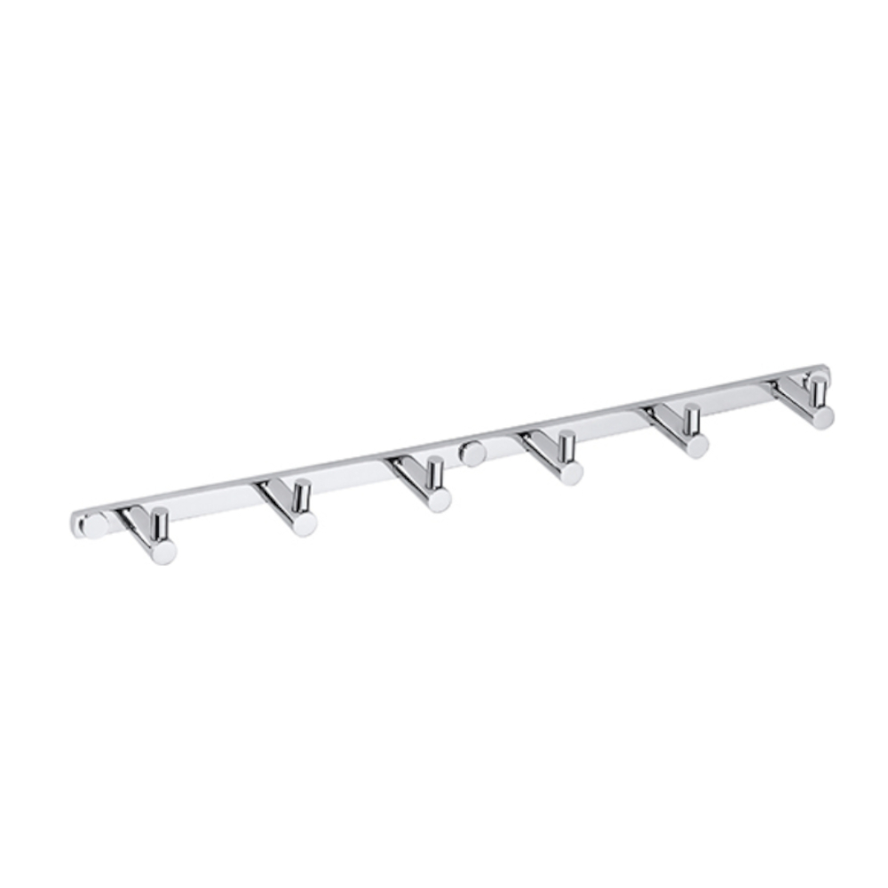 Kromattu koukusto kuudella koukulla. Valmistettu messingistä. Seinäkiinnitys, kiinnitysruuvit piilossa peitelaippojen alla.