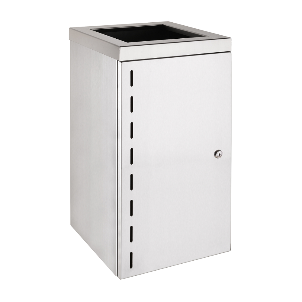 Ruostumattomasta teräksestä valmistettu 45l roska-astia, jonka sisällä irrallinen rst-lankakori roskapussien vaihdon helpottamiseksi. Astia voidaan kiinnittää seinään tai käyttää lattiamallina. Mukana tulee kaksi avainta.