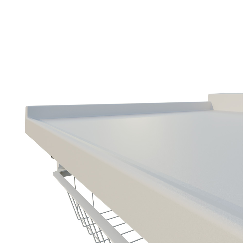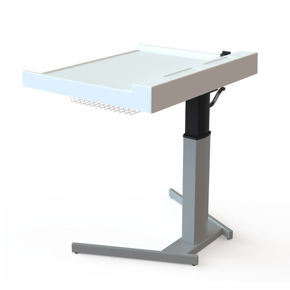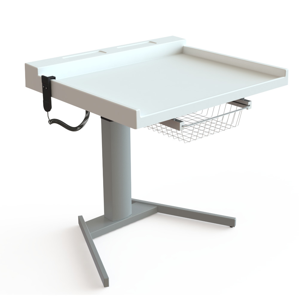 Lattiamallinen hoitopöytä, jonka korkeutta voit säätää 68–120 cm välillä ergonomisuuden varmistamiseksi. Korkeudensäätö tapahtuu mukana tulevan ohjaimen avulla. Muovinen taso on helppo pitää puhtaana ja se kestää erinomaisesti myös kosteutta. Tason alla on ulosvedettävä säilytyskori tarvikkeille. Painoraja 70 kg.