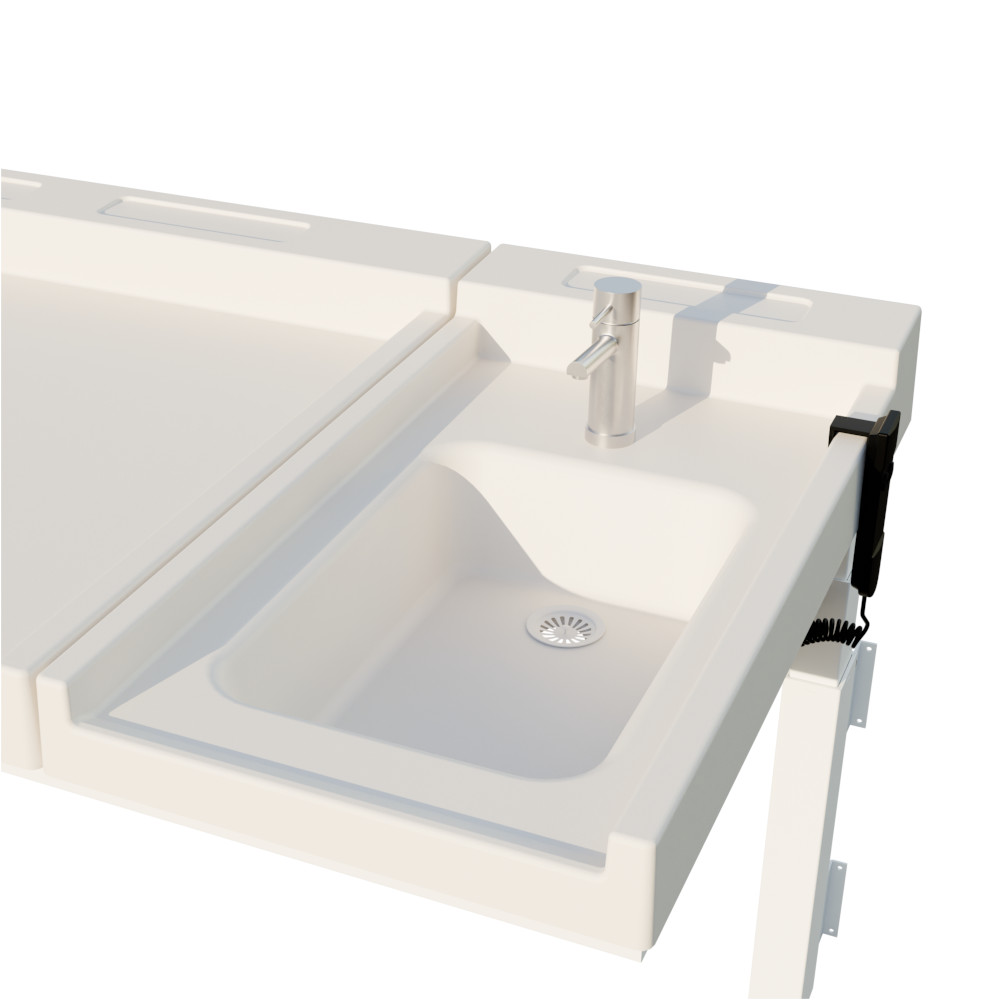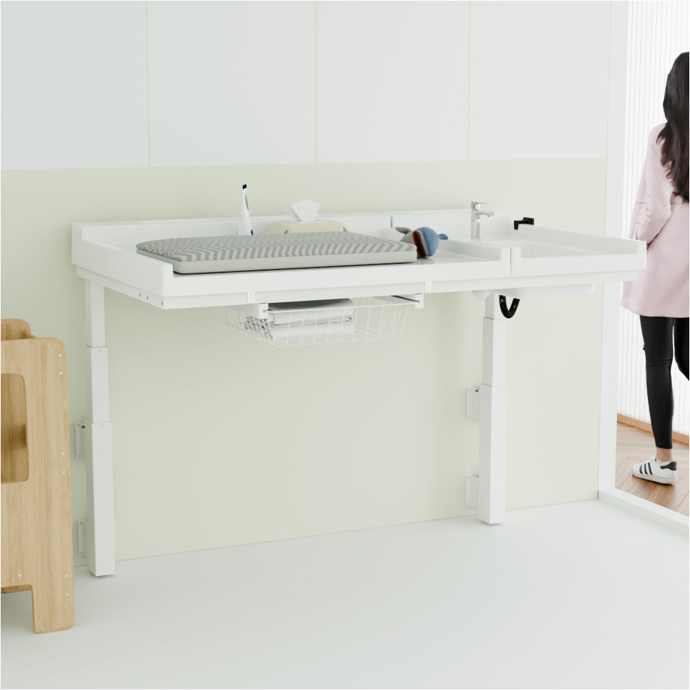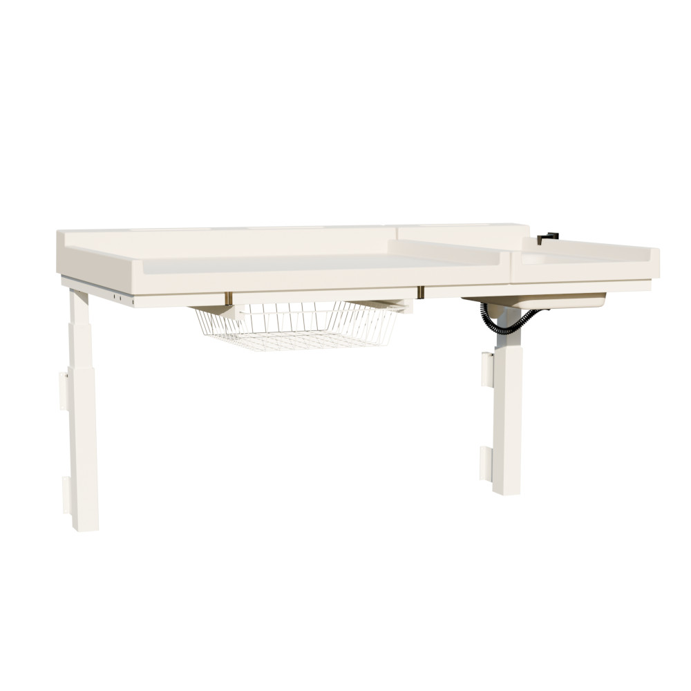 Seinäkiinnitteinen hoitopöytä, jonka korkeutta voit säätää 58–118 cm välillä ergonomisuuden varmistamiseksi (säätövara lattian tasoon kiinnitettynä). Korkeudensäätö tapahtuu mukana tulevan ohjaimen avulla. Hoitotason vieressä on pesuallas, joka voidaan asentaa kummallekkin puolelle. Muovinen taso on helppo pitää puhtaana ja se kestää erinomaisesti myös kosteutta. Tason alla on ulosvedettävä säilytyskori tarvikkeille. Painoraja 40 kg.