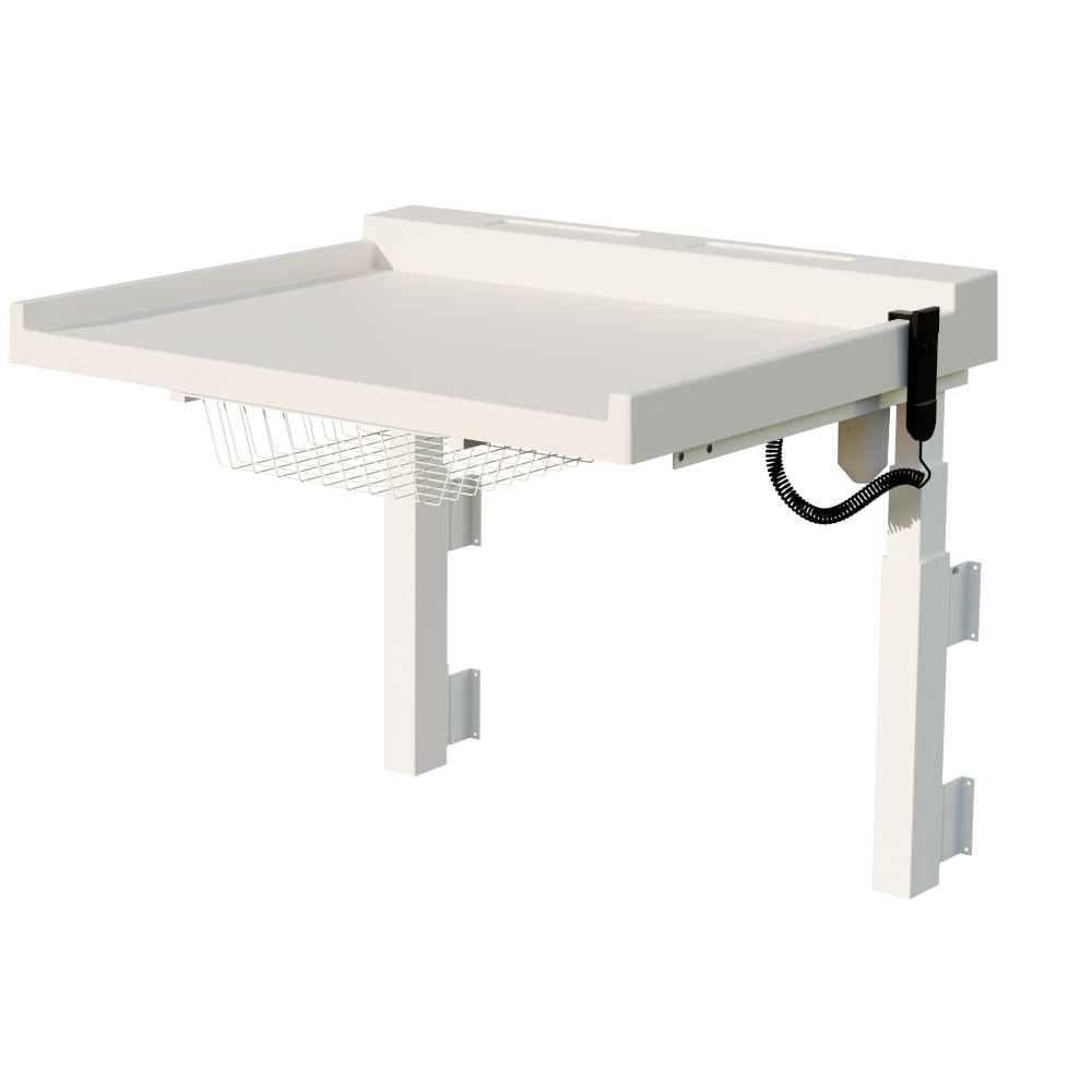Seinäkiinnitteinen hoitopöytä, jonka korkeutta voit säätää 58–118 cm välillä ergonomisuuden varmistamiseksi (säätövara lattian tasoon kiinnitettynä). Korkeudensäätö tapahtuu mukana tulevan ohjaimen avulla. Muovinen taso on helppo pitää puhtaana ja se kestää erinomaisesti myös kosteutta. Tason alla on ulosvedettävä säilytyskori tarvikkeille. Painoraja 40 kg.