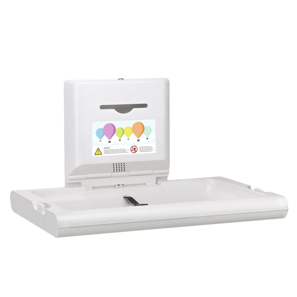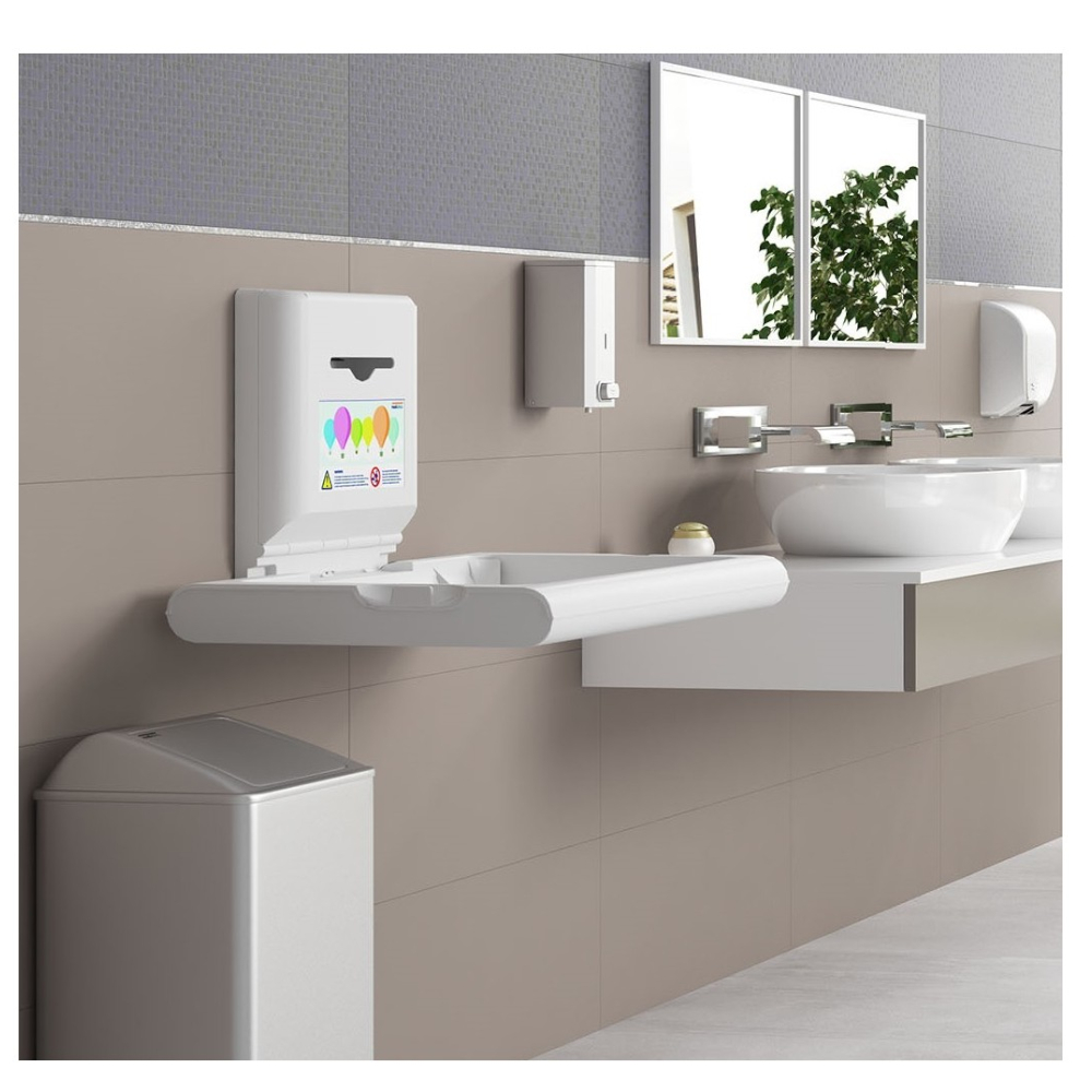 Seinään kiinnitettävä hoitopöytä kestää suurta kulutusta ja 50 kg kuormitusta. Tuote on valmistettu kestävästä antimikrobisesta polypropeeniseoksesta. Hoitopöydässä on sisäänrakennettu ionisaattori, joka eliminoi haitallisia mikrobeja ja epämiellyttäviä hajuja. Tämä hoitopöytä on ihanteellinen ratkaisu julkisiin tiloihin, kuten ostoskeskuksiin, lentokentille, julkisiin rakennuksiin ja päiväkoteihin. Mole mmissa reunoissa on laukkukoukut, jotka pitävät henkilökohtaiset tavarat käden ulottuvilla. Hoitopöydässä on lisäksi turvavyö. Hoitopöytä täyttää EN 12221-1 ja EN 12221-2 -standardit, jotka edellyttävät, että hoitopöydät kestävät 50 kg staattisen kuormituksen yhden tunnin ajan, mikä takaa erinomaisen turvallisuuden ja luotettavuuden. Ionisaattorin toiminta on TÜV Rheinlandin testaama ja hyväksymä. Ionisaattori toimii kolmella AA-paristolla. Tuotteessa on antimikrobinen pinnoite, jonka avulla hoitopöytä pysyy hygieenisempänä käytössä.