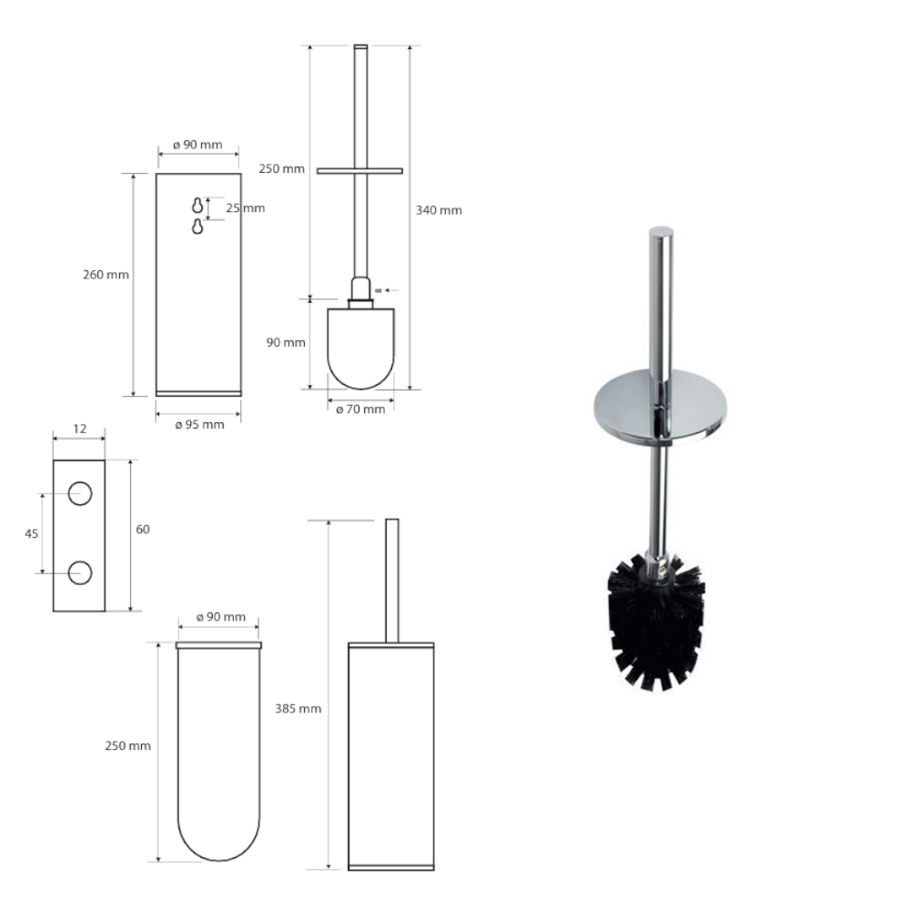 Tyylikäs kromattu seinäkiinnitteinen wc-harjateline. Sisältää harjan. Voidaan käyttää myös lattiamallina.